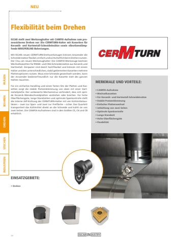 NEUFR%u00c4SEN BOHREN DREHEN STECHEN INDUSTRIENFlexibilit%u00e4t beim DrehenEINSATZGEBIETE:%u2022 DrehenISCAR stellt zwei Werkzeughalter mit CAMFIX-Aufnahme zum prozesssicheren Drehen vor: Die CERMTURN-Halter mit Kassetten f%u00fcr Keramik- und Hartmetall-Schneideins%u00e4tze sowie vibrationsd%u00e4mpfende WHISPERLINE-Bohrstangen.Mit ISCARs neuen CERMTURN-Drehwerkzeugen k%u00f6nnen Anwender die Schneideins%u00e4tze flexibel, einfach und wirtschaftlich beim Drehen nutzen.Der Clou am neuen Werkzeughalter: Die CAMFIX-Werkzeuge besitzen Wechselkassetten f%u00fcr RNGN- und CNG-Schneideins%u00e4tze aus Keramik und Hartmetall. Zerspaner sind damit hochflexibel und k%u00f6nnen mit einem Halter und den unterschiedlichen, stabil geklemmten Kassetten mehrere Plattenoptionen nutzen. Muss eine Schneide gewechselt werden, kann der Anwender bedienerfreundlich nur die Kassette statt des ganzen Halters tauschen.F%u00fcr ein einfaches Handling und einen festen Sitz der Platten und Kassetten sorgt die stabile Pratzenklemmung von oben mit einer Hartmetallplatte. Der verbesserte Mechanismus verhindert, dass sich spr%u00f6de Keramik-Wendeschneidplatten verdrehen oder brechen. F%u00fcr hohe Oberfl%u00e4cheng%u00fcte, lange Standzeiten und optimale Spankontrolle stellt die interne JHP-K%u00fchlung der CERMTURN-Halter mit vier K%u00fchlmittelausl%u00e4ssen %u2013 zwei zur Span- und zwei zur Freifl%u00e4che %u2013 sicher. Das Quartett transportiert das K%u00fchlmittel direkt an die Schneide und k%u00fchlt sie von zwei Seiten. Die CAMFIX-Aufnahmen sind in den Gr%u00f6%u00dfen C5, C6 und C8 erh%u00e4ltlich.MERKMALE UND VORTEILE:%u2022 CAMFIX-Aufnahme%u2022 Wechselkassetten%u2022 F%u00fcr Keramik- und Hartmetall-Schneideins%u00e4tze%u2022 Stabile Pratzenklemmung%u2022 Einfacher Plattenwechsel%u2022 Jetk%u00fchlung von zwei Seiten%u2022 Optimale Spankontrolle%u2022 Lange Standzeit%u2022 Hohe Oberfl%u00e4cheng%u00fcte%u2022 Flexibilit%u00e4t44
