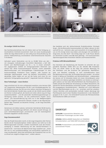 Hochpr%u00e4zise Fr%u00e4stechnologie f%u00fcr sicherheitsrelevante BauteileEin mutiger Schritt ins Fr%u00e4senDas Familienunternehmen hat sich bisher stark auf die Fertigung unterschiedlicher Drehteile konzentriert. Doch ein neues Kundenprojekt stellte die Vegu-Mannschaft vor eine v%u00f6llig neue Herausforderung: die pr%u00e4zise Fr%u00e4sbearbeitung verschiedener sicherheitsrelevanter Bauteile in Gro%u00dfserie.Gefordert waren St%u00fcckzahlen von bis zu 25.000 Teilen pro Jahr %u2013 mit strengsten Anforderungen hinsichtlich Ebenheiten %u2264 0,01 Millimeter und Oberfl%u00e4cheng%u00fcte von Rz %u2264 1,6. In einem wirtschaftlich angespannten Umfeld am Fertigungsstandort %u00d6sterreich war schnell klar: Ohne hochautomatisierte Prozesse, einem passenden Maschinenkonzept und leistungsf%u00e4higen Fr%u00e4swerkzeugen ist eine konkurrenzf%u00e4hige Produktion kaum m%u00f6glich. %u201eMit unserem bestehenden Maschinenpark waren die Bauteile wirtschaftlich nicht darstellbar. Daher haben wir uns auf die Suche nach einer f%u00fcr uns optimalen Fertigungsl%u00f6sung gemacht%u201c, begr%u00fcndet Dominik Velikonja.Neue Technologie %u2013 neues DenkenVegu entschied sich f%u00fcr eine umfassende Investition: eine Hermle C250 mit integriertem Robotersystem RS 05-2 und Schubladenspeicher f%u00fcr die Teilebevorratung. Das Ziel war eine nahezu mannlose Fertigung im Drei-Schicht-Betrieb. Parallel dazu wurde mit der ISCAR Austria GmbH ein Partner ins Boot geholt, der bereits seit vielen Jahren eng mit Vegu zusammenarbeitet %u2013 und die passenden Hochleistungswerkzeuge zur Verf%u00fcgung stellen konnte, um das ambitionierte Projekt umzusetzen. %u201eDie Herausforderung lag nicht nur in der Ma%u00dfgenauigkeit und einer m%u00f6glichst optimierten Taktzeit, sondern in der Reproduzierbarkeit %u00fcber Tausende von Bauteilen hinweg%u201c, so der Vegu-Gesch%u00e4ftsf%u00fchrer weiter.Gemeinsam mit Volker Labrenz, technischer Vertrieb bei ISCAR Austria, wurden vier Fr%u00e4swerkzeuge definiert, mit denen sowohl Schrupp- als auch Schlichtbearbeitungen prozesssicher und mit bestm%u00f6glicher Standzeit abgedeckt werden k%u00f6nnen.Enge ZusammenarbeitWas das Projekt besonders macht, ist die enge Integration aller Partner bereits ab der Konzeptionsphase. Volker Labrenz war nicht nur in die Werkzeugauswahl involviert, sondern koordinierte auch die Prozessauslegung in direkter Abstimmung mit den Hermle-Technikern in Gosheim (D) %u2013 noch bevor die Maschine bei Vegu installiert war. %u201eUnser Ziel war es, eine produktionsf%u00e4hige und wirtschaftlich optimierte L%u00f6sung vorzubereiten, damit das Hochfahren der Produktion hier vor Ort so schnell wie m%u00f6glich erfolgen kann%u201c, erkl%u00e4rt Labrenz.Das best%u00e4tigt auch der stellvertretende Produktionsleiter Christoph Sungi: %u201eDie professionelle Zusammenarbeit mit Volker Labrenz ist sehr wertvoll f%u00fcr uns %u2013 technisch, aber auch menschlich. Er ist regelm%u00e4%u00dfig bei uns vor Ort, bringt immer neue Ideen und L%u00f6sungen mit und bleibt so lange dran, bis alles l%u00e4uft.%u201c Der Erfolg zeigt sich in der Praxis: Bereits vor Serienstart wurden rund 500 Teile gefertigt %u2013 mit kontinuierlichen Optimierungsschritten hinsichtlich Taktzeit und Prozesssicherheit.Pr%u00e4zision trifft WirtschaftlichkeitDas Herzst%u00fcck der Bearbeitung der Bauteile ist sicherlich der ausgew%u00e4hlte Planfr%u00e4ser SOF45 8/16 aus der HELIDO 800 Produktfamilie von ISCAR. Dieser ist bei Vegu das zentrale Werkzeug f%u00fcr das Planfr%u00e4sen und das Erreichen der geforderten Oberfl%u00e4cheng%u00fcte und Ebenheit zust%u00e4ndig. Je nach Aufma%u00dfsituation kann das Werkzeug mit acht oder 16 Schneiden best%u00fcckt werden %u2013 ein echter Vorteil in Bezug auf Flexibilit%u00e4t und Wirtschaftlichkeit. %u201eInsbesondere die Version mit 16 Schneiden bietet mit einem Schneidenpreis unter einem Euro ein %u00fcberaus g%u00fcnstiges Verh%u00e4ltnis von Kosten zu Leistung%u201c, geht Labrenz auf die hohe Wirtschaftlichkeit des Planfr%u00e4ssystems ein.Zudem erlaubt der SOF45 die Verwendung von Wiper-Geometrien, die speziell f%u00fcr feinste Oberfl%u00e4chen entwickelt wurden. %u201eDamit k%u00f6nnen wir die vorgegebenen Qualit%u00e4tskriterien %u2013 Ebenheit von %u2264 0,01 Millimeter und die Oberfl%u00e4cheng%u00fcte von Rz %u2264 1,6 %u2013 erreichen, auch bei unterbrochenen Schnitten und wechselndem Aufma%u00df. Zudem %u00fcberzeugt das Planfr%u00e4ssystem durch einen flexiblen Einsatzbereich in den Werkstoffgruppen P, M, K und S. Als Schneidstoff kommt die PVD-beschichtete Hartmetallsorte IC830 zum Einsatz.%u201cSHORTCUTAUFGABE: Automatisches Abstechen von 70-Millimeter-Titanstangen aus dem VollenL%u00d6SUNG: MODULARGRIP-Abstechkit mit TANGPADSchneidenhaltern und TANG-GRIP-Schneideins%u00e4tzen NUTZEN: Prozesssicherer und wirtschaftlicher automatischer ProzessiWirtschaftliche Serienproduktion rund um die Uhr: die Hermle C250 mit integrierter RS 05-2Roboterzelle und Schubladenspeicher.Vielseitig. Wirtschaftlich. Pr%u00e4zise: Der SOF45 8/16 von ISCAR %u00fcberzeugt mit acht oder 16 Schneiden je nach Aufma%u00df, optionaler Wiper-Geometrie f%u00fcr beste Oberfl%u00e4chen und herausragender Wirtschaftlichkeit %u2013 ideal f%u00fcr anspruchsvolle Serienprozesse wie bei Vegu.7