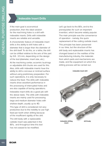 100 ISCAR GENERAL PURPOSE DRILLING %u00bd%u0009Indexable Insert DrillsIf the main goal is economical production, then the ideal solution for the machining holes is a drill with indexable inserts. Drills with indexable inserts are reliable and versatile. A characteristic feature of indexable insert drills is the ability to drill holes with a diameter that is larger than the diameter of the drill itself. To do this, on a lathe, the drill can be shifted relative to the axis of the part by 0.8 - 3.5 mm, depending on the design of the tool (diameter, insert size, etc.). At the machining center, eccentric bushings or adjustable drill chucks are used for this. Also, drills with indexable inserts have the ability to drill a concave or inclined surface without using preliminary preparation. For such operations, it is only necessary to reduce the feed. The drills with indexable inserts show excellent performance in the processing of interrupted holes and are also capable of boring operations. Indexable insert drills do a good job with the above tasks. The drills with indexable inserts are mainly used for processing large and medium diameter holes with shallow depth, usually up to 4D. This type of drill is considered not very productive due to the inability to use high feed per tooth when drilling because of the insufficient rigidity of the drill. The drill body with a replaceable carbide insert was patented in the 80's, and throughout time this tool has not ceased to be modified.Let%u2019s go back to the 80's, and to the prerequisites for such an important invention, which became widely popular. The main principle was the convenience of operation - namely, the quick replacement of the cutting carbide insert. This principle has been preserved in our time, but the structure of the drill body and replaceable inserts has changed based on the realities of the manufacturing industry, the materials from which parts and mechanisms are made, and the equipment on which the drilling process will be carried out. indexable insert drillindexable drilling insertdrill body