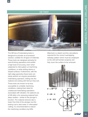 101GENERAL PURPOSE DRILLINGDR-TWISTThe DR line of holemaking tools is designed to provide an economical solution, suitable for all types of materials. These tools are designed primarily for semi-finishing operations and exhibit a high level of accuracy, even when subjected to interrupted cut machining conditions, or while drilling stacks or sloped surfaces. Furthermore, with the right edge geometry these tools can easily perform an angular penetration holemaking operation, drilling into the material and exiting with flat burr-free exit.These tools are known to be less susceptible to unstable machining conditions, making them ideal for unbalanced holemaking operations associated with vibration. An optional use of DR drills is for removing material from deep cavities %u2013 similar to the plunger%u2019s function. The material removal rate is lower than that of the plunger, but the tooling cost is also lower. In interrupted cutting, it is recommended to reduce the machining conditions by 50%.Attached is a sketch and the calculations required for the correct overlapping sidestep pattern which must be employed so the drill will function properly and fully cover the surface to be removed.P = %u221aZ2 %u2212 L2Z = 2R %u2212 XL = R %u2212 X/2ZXPX2LLRL