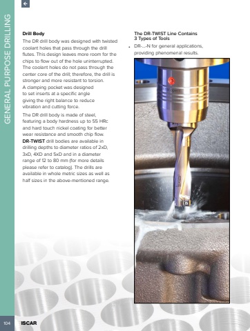 104 ISCAR GENERAL PURPOSE DRILLINGDrill BodyThe DR drill body was designed with twisted coolant holes that pass through the drill flutes. This design leaves more room for the chips to flow out of the hole uninterrupted. The coolant holes do not pass through the center core of the drill; therefore, the drill is stronger and more resistant to torsion. A clamping pocket was designed to set inserts at a specific angle giving the right balance to reduce vibration and cutting force.The DR drill body is made of steel, featuring a body hardness up to 55 HRc and hard touch nickel coating for better wear resistance and smooth chip flow. DR-TWIST drill bodies are available in drilling depths to diameter ratios of 2xD, 3xD, 4XD and 5xD and in a diameter range of 12 to 80 mm (for more details please refer to catalog). The drills are available in whole metric sizes as well as half sizes in the above-mentioned range. The DR-TWIST Line Contains 3 Types of Tools %u2022 DR-%u2026-N for general applications, providing phenomenal results.