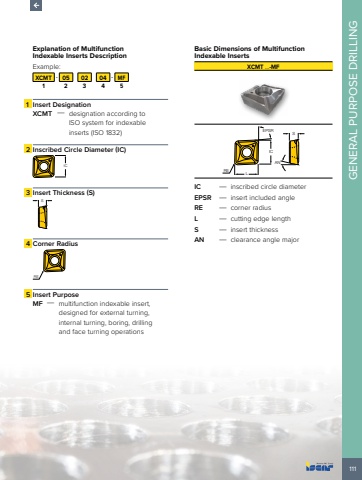 111GENERAL PURPOSE DRILLINGExplanation of Multifunction Indexable Inserts Description Example:XCMT - 05 02 04 - MF1 2 3 4 51 Insert DesignationXCMT %u2014 designation according to ISO system for indexable inserts (ISO 1832)2 Inscribed Circle Diameter (IC) IC3 Insert Thickness (S) S4 Corner Radius RE5 Insert PurposeMF %u2014 multifunction indexable insert, designed for external turning, internal turning, boring, drilling and face turning operations Basic Dimensions of Multifunction Indexable InsertsXCMT %u2026-MFEPSRL REICANSIC %u2014 inscribed circle diameterEPSR %u2014 insert included angleRE %u2014 corner radiusL %u2014 cutting edge lengthS %u2014 insert thicknessAN %u2014 clearance angle major