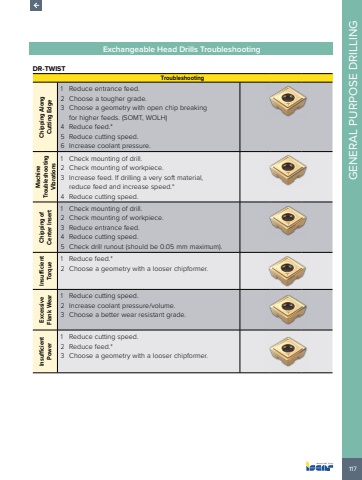 117GENERAL PURPOSE DRILLINGExchangeable Head Drills TroubleshootingDR-TWIST TroubleshootingChipping Along Cutting Edge1 Reduce entrance feed.2 Choose a tougher grade.3 Choose a geometry with open chip breaking for higher feeds. (SOMT, WOLH)4 Reduce feed.*5 Reduce cutting speed.6 Increase coolant pressure.Machine Troubleshooting Vibrations1 Check mounting of drill.2 Check mounting of workpiece.3 Increase feed. If drilling a very soft material, reduce feed and increase speed.*4 Reduce cutting speed.Chipping of Center Insert1 Check mounting of drill.2 Check mounting of workpiece.3 Reduce entrance feed.4 Reduce cutting speed.5 Check drill runout (should be 0.05 mm maximum).Insufficient Torque1 Reduce feed.*2 Choose a geometry with a looser chipformer.Excessive Flank Wear1 Reduce cutting speed.2 Increase coolant pressure/volume.3 Choose a better wear resistant grade.Insufficient Power1 Reduce cutting speed.2 Reduce feed.*3 Choose a geometry with a looser chipformer.