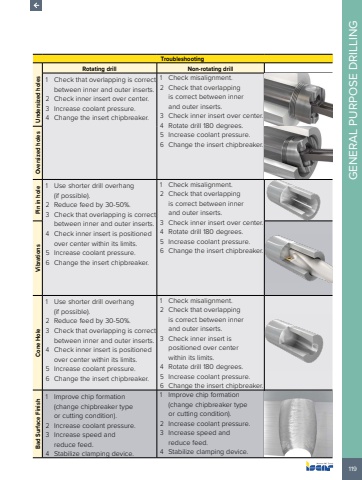 119GENERAL PURPOSE DRILLINGTroubleshootingRotating drill Non-rotating drillUndersized holes1 Check that overlapping is correct between inner and outer inserts.2 Check inner insert over center. 3 Increase coolant pressure. 4 Change the insert chipbreaker.1 Check misalignment. 2 Check that overlapping is correct between inner and outer inserts.3 Check inner insert over center. 4 Rotate drill 180 degrees. 5 Increase coolant pressure. 6 Change the insert chipbreaker. Oversized holes Pin in hole1 Use shorter drill overhang (if possible).2 Reduce feed by 30-50%. 3 Check that overlapping is correct between inner and outer inserts.4 Check inner insert is positioned over center within its limits.5 Increase coolant pressure. 6 Change the insert chipbreaker.1 Check misalignment. 2 Check that overlapping is correct between inner and outer inserts.3 Check inner insert over center. 4 Rotate drill 180 degrees. 5 Increase coolant pressure. 6 Change the insert chipbreaker. Vibrations Cone Hole 1 Use shorter drill overhang (if possible).2 Reduce feed by 30-50%. 3 Check that overlapping is correct between inner and outer inserts.4 Check inner insert is positioned over center within its limits.5 Increase coolant pressure. 6 Change the insert chipbreaker.1 Check misalignment. 2 Check that overlapping is correct between inner and outer inserts.3 Check inner insert is positioned over center within its limits.4 Rotate drill 180 degrees. 5 Increase coolant pressure. 6 Change the insert chipbreaker.Bad Surface Finish1 Improve chip formation (change chipbreaker type or cutting condition).2 Increase coolant pressure. 3 Increase speed and reduce feed.4 Stabilize clamping device.1 Improve chip formation (change chipbreaker type or cutting condition).2 Increase coolant pressure. 3 Increase speed and reduce feed.4 Stabilize clamping device.
