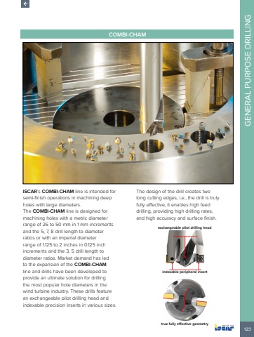 123GENERAL PURPOSE DRILLINGCOMBI-CHAMISCAR%u2019s COMBI-CHAM line is intended for semi-finish operations in machining deep holes with large diameters. The COMBI-CHAM line is designed for machining holes with a metric diameter range of 26 to 50 mm in 1 mm increments and the 5, 7, 8 drill length to diameter ratios or with an imperial diameter range of 1.125 to 2 inches in 0.125 inch increments and the 3, 5 drill length to diameter ratios. Market demand has led to the expansion of the COMBI-CHAMline and drills have been developed to provide an ultimate solution for drilling the most popular hole diameters in the wind turbine industry. These drills feature an exchangeable pilot drilling head and indexable precision inserts in various sizes. The design of the drill creates two long cutting edges, i.e., the drill is truly fully effective, it enables high feed drilling, providing high drilling rates, and high accuracy and surface finish.exchangeable pilot drilling headindexable peripheral inserttrue fully effective geometry