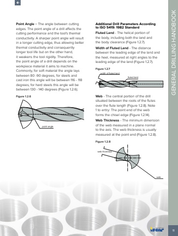 11 GENERAL DRILLING HANDBOOKPoint Angle %u2013 The angle between cutting edges. The point angle of a drill affects the cutting performance and the tool's thermal conductivity. A sharper point angle will result in a longer cutting edge, thus allowing better thermal conductivity and consequently longer tool life but on the other hand, it weakens the tool rigidity. Therefore, the point angle of a drill depends on the workpiece material it aims to machine. Commonly, for soft material the angle lays between 80 -90 degrees, for steels and cast iron this angle will be between 116 - 118 degrees, for hard steels this angle will be between 130 - 140 degrees (Figure 1.2.6).Figure 1.2.6point angleAdditional Drill Parameters According to ISO 5419: 1982 StandardFluted Land - The helical portion of the body, including both the land and the body clearance (Figure 1.2.7).Width of Fluted Land - The distance between the leading edge of the land and the heel, measured at right angles to the leading edge of the land (Figure 1.2.7).Figure 1.2.7width of fluted landfluted landWeb - The central portion of the drill situated between the roots of the flutes over the flute length (Figure 1.2.8). Note 1 to entry: The point end of the web forms the chisel edge (Figure 1.2.14).Web Thickness - The minimum dimension of the web measured in a plane normal to the axis. The web thickness is usually measured at the point end (Figure 1.2.8).Figure 1.2.8web thickness web