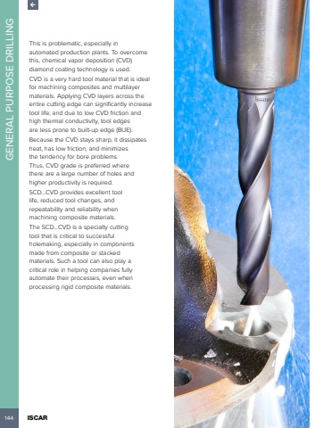 144 ISCAR GENERAL PURPOSE DRILLINGThis is problematic, especially in automated production plants. To overcome this, chemical vapor deposition (CVD) diamond coating technology is used. CVD is a very hard tool material that is ideal for machining composites and multilayer materials. Applying CVD layers across the entire cutting edge can significantly increase tool life, and due to low CVD friction and high thermal conductivity, tool edges are less prone to built-up edge (BUE). Because the CVD stays sharp, it dissipates heat, has low friction, and minimizes the tendency for bore problems. Thus, CVD grade is preferred where there are a large number of holes and higher productivity is required. SCD...CVD provides excellent tool life, reduced tool changes, and repeatability and reliability when machining composite materials. The SCD...CVD is a specialty cutting tool that is critical to successful holemaking, especially in components made from composite or stacked materials. Such a tool can also play a critical role in helping companies fully automate their processes, even when processing rigid composite materials.