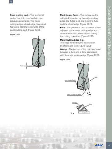 13GENERAL DRILLING HANDBOOKPoint (cutting part) - The functional part of the drill comprised of chipproducing elements. The major cutting edges, chisel edge, faces and flanks are therefore elements of the point (cutting part) (Figure 1.2.13).Figure 1.2.12Point (cutting part)Flank (major flank) - The surface on the drill point bounded by the major cutting edge, the fluted land, the following flute, and the chisel edge (Figure 1.2.13).Face - The portion of the surface of a flute adjacent to the major cutting edge and on which the chip when formed during the cutting operation. (Figure 1.2.13).Major Cutting Edge (lip) - The edge formed by the Intersection of a flank and face (Figure 1.2.13).Wedge - The portion of the point enclosed between a face and a flank associated with the major cutting edge (Figure 1.2.13).Figure 1.2.13flank (major flank) facemajor cutting edge (lip)wedge faceflank (major flank)