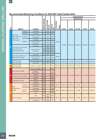 148 ISCAR GENERAL PURPOSE DRILLINGRecommended Machining Conditions for SCD-SXC Solid Carbide Drills ISOMaterial Condition Material Group No. Tensile Strength [N/mm2] Hardness HBCutting SpeedVc (m/min)Cutting DiameterFeed (mm/rev)3.0-5.0 5.1-8.0 8.1-10.0 10.1-16 16.1-20Pnon-alloy steel and cast steel, free cutting steel<0.25% C annealed 1 420 12570-900.1-0.18 0.14-0.24 0.16-0.26 0.18-0.3 0.2-0.35%u22650.25% C annealed 2 650 190<0.55% C quenched and tempered 3 850 250%u22650.55% Cannealed 4 750 220quenched and tempered 5 1000 300low alloy and cast steel (less than 5% of alloying elements)annealed 6 600 200quenched and tempered7 930 2758 1000 3009 1200 350high alloyed steel, cast steel and tool steelannealed 10 680 200quenched and 75-85tempered 11 1100 325stainless steel and cast steelferritic/martensitic 12 680 20060-70 0.08-0.14 0.1-0.18 0.12-0.2 0.14-0.22 0.16-0.24martensitic 13 820 240M stainless steel and cast steel austenitic, duplex 14 600 180 55-65 0.06-0.14 0.08-0.16 0.1-0.18 0.12-0.2 0.14-0.24Kgray cast iron (GG) ferritic / pearlitic 15 18080-100 0.14-0.24 0.16-0.26 0.18-0.0.3 0.2-0.35 0.25-0.45pearlitic / martensitic 16 260nodular cast iron (GGG)ferritic 17 160pearlitic 18 250malleable cast ironferritic 19 130pearlitic 20 230Shigh temperature alloysfe basedannealed 31 20035-45 0.06-0.12 0.08-0.16 0.1-0.18 0.12-0.2 0.12-0.22hardened 32 280Ni or Co basedannealed 33 250hardened 34 350 30-40 0.06-0.12 0.08-0.16 0.1-0.18 0.12-0.2 0.12-0.22cast 35 320titanium alloyspure 36 RM 400 19035-45 0.06-0.12 0.08-0.16 0.1-0.18 0.12-0.2 0.12-0.22alpha+beta alloys, hardened 37 RM 1050 310