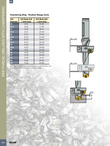 166 ISCAR PRE-THREAD DRILLING WITH CHAMFERING Chamfering Ring - Position Range (mm)Drill DiameterDrill Body 3xD L (min-max)Drill Body 5xD L (min-max)10 8-16 15-3610.5 8-18 17-3911 8-19 18-4111.5 8-21 20-4412 8-22 21-4612.5 8-24 23-4913 8-25 24-5113.5 8-27 26-5414 9-29 28-5714.5 9-30 29-6015 9-31 30-6016 9-33 32-6517 11-35 34-6918 11-38 34-7419 11-42 41-8020 11-45 44-85Note: the %u201cL%u201d dimension shown is relative to the common 1mm chamfer. For other sizes, adjust %u201cL%u201d accordingly.Min. 1 mmMin. 1 mmL1mm(1)