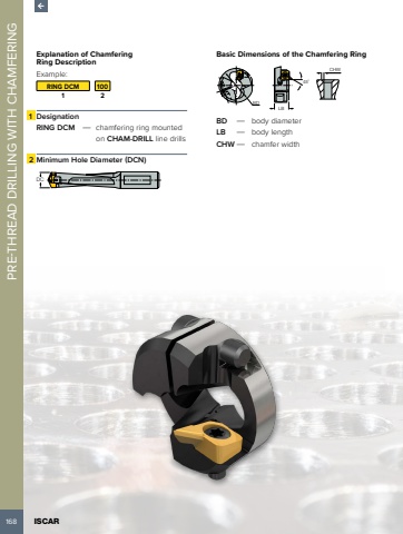 168 ISCAR PRE-THREAD DRILLING WITH CHAMFERING Explanation of Chamfering Ring Description Example:RING DCM 1001 21 DesignationRING DCM %u2014 chamfering ring mounted on CHAM-DRILL line drills2 Minimum Hole Diameter (DCN)DC Basic Dimensions of the Chamfering RingBD45%u02daLBCHWBD %u2014 body diameterLB %u2014 body lengthCHW %u2014 chamfer width