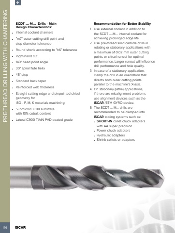 176 ISCAR PRE-THREAD DRILLING WITH CHAMFERING SCDT %u2026-M%u2026 Drills - MainDesign Characteristics:%u2022 Internal coolant channels%u2022 %u201cm7%u201d outer cutting drill point and step diameter tolerance%u2022 Round shank according to %u201ch6%u201d tolerance%u2022 Right-hand cut%u2022 140%u00b0 head point angle%u2022 30%u00b0 spiral flute helix%u2022 45%u00b0 step%u2022 Standard back taper%u2022 Reinforced web thickness%u2022 Straight cutting edge and pinpointed chisel geometry for ISO - P, M, K materials machining%u2022 Submicron IC08 substrate with 10% cobalt content%u2022 Latest IC900 TiAlN PVD coated gradeRecommendation for Better Stability1 Use external coolant in addition to the SCDT %u2026-M%u2026 internal coolant for achieving prolonged edge life.2 Use pre-thread solid carbide drills in rotating or stationary applications with a maximum of 0.02 mm outer cutting points or chisel runout for optimal performance. Larger runout will influence drill performance and hole quality.3 In case of a stationary application, clamp the drill in an orientation that directs both outer cutting points parallel to the machine%u2019s X-axis.4 On stationary (lathe) applications, if there are misalignment problems use alignment devices such as the ISCAR /ETM GYRO device. 5 The SCDT %u2026-M%u2026 drills are recommended to be clamped into ISCAR tooling systems such as:%u2022 SHORT-IN collet chuck adapters with AA super precision%u2022 Power chuck adapters%u2022 Hydraulic adapters%u2022 Shrink collets or adapters