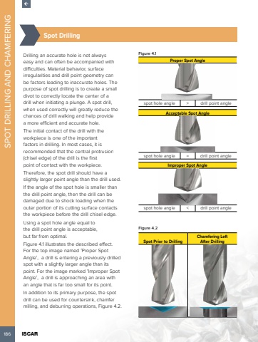 186 ISCAR SPOT DRILLING AND CHAMFERING %u00bd%u0009Spot DrillingDrilling an accurate hole is not always easy and can often be accompanied with difficulties. Material behavior, surface irregularities and drill point geometry can be factors leading to inaccurate holes. The purpose of spot drilling is to create a small divot to correctly locate the center of a drill when initiating a plunge. A spot drill, when used correctly will greatly reduce the chances of drill walking and help provide a more efficient and accurate hole.The initial contact of the drill with the workpiece is one of the important factors in drilling. In most cases, it is recommended that the central protrusion (chisel edge) of the drill is the first point of contact with the workpiece. Therefore, the spot drill should have a slightly larger point angle than the drill used.If the angle of the spot hole is smaller than the drill point angle, then the drill can be damaged due to shock loading when the outer portion of its cutting surface contacts the workpiece before the drill chisel edge.Using a spot hole angle equal to the drill point angle is acceptable, but far from optimal.Figure 4.1 illustrates the described effect. For the top image named %u2018Proper Spot Angle%u2019, a drill is entering a previously drilled spot with a slightly larger angle than its point. For the image marked %u2018Improper Spot Angle%u2019, a drill is approaching an area with an angle that is far too small for its point.In addition to its primary purpose, the spot drill can be used for countersink, chamfer milling, and deburring operations, Figure 4.2.Figure 4.1 Proper Spot Anglespot hole angle > drill point angleAcceptable Spot Anglespot hole angle = drill point angleImproper Spot Anglespot hole angle < drill point angleFigure 4.2 Spot Prior to DrillingChamfering LeftAfter Drilling