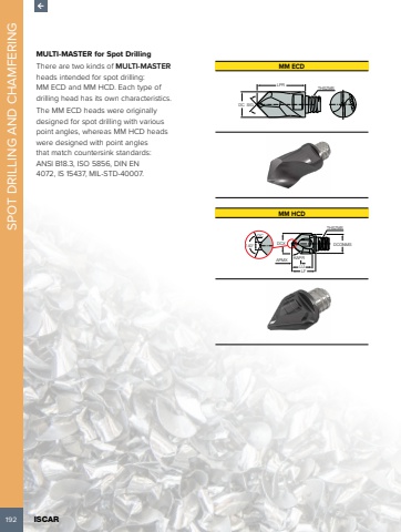 192 ISCAR SPOT DRILLING AND CHAMFERINGMULTI-MASTER for Spot DrillingThere are two kinds of MULTI-MASTERheads intended for spot drilling: MM ECD and MM HCD. Each type of drilling head has its own characteristics.The MM ECD heads were originally designed for spot drilling with various point angles, whereas MM HCD heads were designed with point angles that match countersink standards: ANSI B18.3, ISO 5856, DIN EN 4072, IS 15437, MIL-STD-40007.MM ECDDC SIGLPRTHSZMSMM HCD140%u00b0DCDCONMSLFAPMX KAPRLUDCXTHSZMS