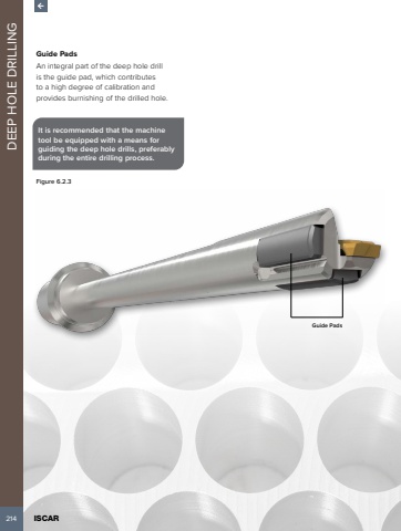 214 ISCAR DEEP HOLE DRILLINGGuide PadsAn integral part of the deep hole drill is the guide pad, which contributes to a high degree of calibration and provides burnishing of the drilled hole.It is recommended that the machine tool be equipped with a means for guiding the deep hole drills, preferably during the entire drilling process.Figure 6.2.3 Guide Pads