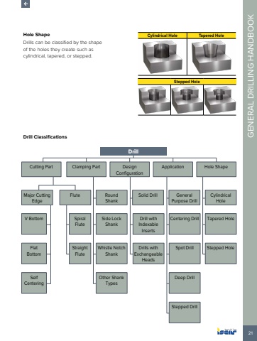 21GENERAL DRILLING HANDBOOKHole ShapeDrills can be classified by the shape of the holes they create such as cylindrical, tapered, or stepped.Cylindrical Hole Tapered HoleStepped HoleDrillCutting PartMajor CuttingEdgeFlute Round ShankSolid Drill GeneralPurpose DrillCylindricalHoleDrill with Tapered HoleIndexableInsertsSide LockShankSpiralFluteV BottomWhistle NotchShankStraightFluteFlatBottomSelfCenteringOther ShankTypesCentering DrillSpot DrillDeep DrillStepped DrillDrills with Stepped HoleExchangeableHeadsClamping Part DesignConfigurationApplication Hole ShapeDrill Classifications
