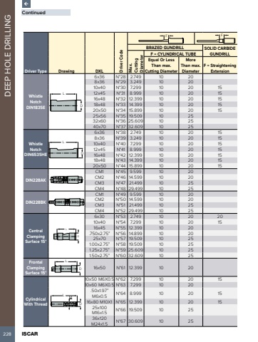 228 ISCAR DEEP HOLE DRILLINGDriver Type Drawing DXL Driver CodeF FBRAZED GUNDRILL SOLID CARBIDE GUNDRILLMax.CuttingDiameterF = CYLINDRICAL TUBEEqual Or LessThan max.Cutting DiameterMoreThan max.DiameterF = StraighteningExtensionWhistle Notch DIN1835ELD6x36 N%u00b028 2.749 10 208x36 N%u00b029 3.249 10 2010x40 N%u00b030 7.299 10 20 1512x45 N%u00b031 8.999 10 20 1516x48 N%u00b032 12.399 10 20 1518x48 N%u00b033 14.399 10 20 1520x50 N%u00b034 15.899 10 20 1525x56 N%u00b035 19.509 10 2532x60 N%u00b036 25.609 10 2540x70 N%u00b037 32.609 10 25Whistle Notch DIN6535HELD6x36 N%u00b038 2.749 10 20 158x36 N%u00b039 3.249 10 20 1510x40 N%u00b040 7.299 10 20 1512x45 N%u00b041 8.999 10 20 1516x48 N%u00b042 12.399 10 20 1518x48 N%u00b043 14.399 10 20 1520x50 N%u00b044 15.899 10 20 15DIN228AKCM1 N%u00b045 9.599 10 20CM2 N%u00b046 14.599 10 20CM3 N%u00b047 21.499 10 25CM4 N%u00b048 29.499 10 25DIN228BKCM1 N%u00b049 9.599 10 20CM2 N%u00b050 14.599 10 20CM3 N%u00b051 21.499 10 25CM4 N%u00b052 29.499 10 25Central Clamping Surface 15%u00b0LD6x30 N%u00b053 2.749 10 20 2010x40 N%u00b054 7.299 10 20 1516x45 N%u00b055 12.399 10 20.750x2.75%u201d N%u00b056 14.899 10 2025x70 N%u00b057 19.509 10 251.00x2.75%u201d N%u00b058 19.509 10 251.25x2.75%u201d N%u00b059 25.609 10 251.50x2.75%u201d N%u00b060 32.609 10 25Frontal Clamping Surface 15%u00b0LD 16x50 N%u00b061 12.399 10 20CylindricalWith ThreadL MD10x50 M6X0.5 N%u00b062 7.299 10 20 1510x60 M6X0.5 N%u00b063 7.299 10 20.50x1.97%u201dM6x0.5 N%u00b064 8.999 10 20 1516x80 M10X1 N%u00b065 12.399 10 20 1525x100 M16x1.5 N%u00b066 19.509 10 2536x120 M24x1.5 N%u00b067 30.609 10 25Continued