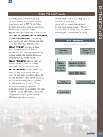 235DEEP HOLE DRILLINGISCAR BTA Drill ProductsCurrently, drills of the BTA (Boring and Trepanning Association) system, also known as the STS (Single Tube System), are widely used for machining deep holes in various designs.ISCAR offers three families of BTA system drills: ISCAR TRI-DEEP, ISCAR FINE-BEAM, and ISCAR-DEEP-DRILL. Each family can machine all types of materials, but each has its unique characteristics.ISCAR TRI-DEEP provides a deep hole machining solution with an indexable insert featuring three cutting edges, suitable for drilling diameters ranging from 16 mm to 40 mm.ISCAR FINE-BEAM offers a solution with indexable inserts for drilling diameters from 25 mm to 89 mm.ISCAR-DEEP-DRILL offers a versatile solution with adjustable cartridges carrying indexable inserts designed for drilling diameters from 38 mm to 291.99 mm, as well as a brazed tip solution for diameters from 8 mm to 65 mm.BTA system drilling heads with indexable inserts are available with both external four-start threads and internal single-start threads, guaranteeing IT10 hole diameter accuracy. Drilling heads with a brazed tip up to a diameter of 14.79 mm come with an external single-start thread, while those above 14.79 mm feature external two or four-start threads, ensuring IT9 hole diameter accuracy.BTA Drill HeadsIndexableInsert DrillsBrazed TipsDrilling HeadModular Drill Head (WithoutCartridges)Adjustable Drill Head(With Cartridges)ISCAR-DEEP-DRILLTRI-DEEP ISCAR-DEEP-DRILLFINE-BEAM