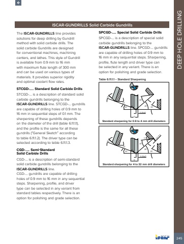 245DEEP HOLE DRILLINGISCAR-GUNDRILLS Solid Carbide GundrillsThe ISCAR-GUNDRILLS line provides solutions for deep drilling by Gundrill method with solid carbide drills. The solid carbide Gundrills are designed for conventional machines, machining centers, and lathes. This style of Gundrill is available from 0.9 mm to 16 mm with maximum flute length of 300 mm and can be used on various types of materials. It provides superior rigidity and optimal coolant flow rates.STCGD-%u2026. Standard Solid Carbide DrillsSTCGD-%u2026 is a description of standard solid carbide gundrills belonging to the ISCAR-GUNDRILLS line. STCGD-%u2026 gundrills are capable of drilling holes of 0.9 mm to 16 mm in sequential steps of 0.1 mm. The sharpening of these gundrills depends on the diameter of the drill (table 6.11.1.1), and the profile is the same for all these gundrills (%u201cGeneral Sketch%u201d according to table 6.11.1.2). The driver type can be selected according to table 6.11.1.3.CGD-%u2026. Semi-StandardSolid Carbide DrillsCGD-%u2026 is a description of semi-standard solid carbide gundrills belonging to the ISCAR-GUNDRILLS line. CGD-%u2026 gundrills are capable of drilling holes of 0.9 mm to 16 mm in any sequential steps. Sharpening, profile, and driver type can be selected in any variant from standard tables respectively. There is an option for polishing and grade selection.SPCGD-%u2026. Special Solid Carbide DrillsSPCGD-%u2026 is a description of special solid carbide gundrills belonging to the ISCAR-GUNDRILLS line. SPCGD-%u2026 gundrills are capable of drilling holes of 0.9 mm to 16 mm in any sequential steps. Sharpening, profile, flute length and driver type can be selected in any variant. There is an option for polishing and grade selection.Table 6.11.1.1 %u2013 Standard SharpeningD0.25xD30%u02da15%u02da30%u02da30%u02da40%u02da 35%u02daStandard sharpening for 0.9 to 4 mm drill diametersD30%u02da12%u02da20%u02da20%u02da30%u02da25%u02da12%u02da 0.3-0.50.25xDStandard sharpening for 4 to 32 mm drill diameters