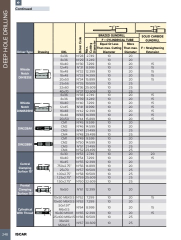248 ISCAR DEEP HOLE DRILLINGContinuedDriver Type Drawing DXL Driver CodeF FBRAZED GUNDRILL SOLID CARBIDE GUNDRILLMax.CuttingDiameterF = CYLINDRICAL TUBEEqual Or LessThan max. CuttingDiameterMoreThan max.DiameterF = StraighteningExtensionWhistle Notch DIN1835ELD6x36 N%u00b028 2.749 10 208x36 N%u00b029 3.249 10 2010x40 N%u00b030 7.299 10 20 1512x45 N%u00b031 8.999 10 20 1516x48 N%u00b032 12.399 10 20 1518x48 N%u00b033 14.399 10 20 1520x50 N%u00b034 15.899 10 20 1525x56 N%u00b035 19.509 10 2532x60 N%u00b036 25.609 10 2540x70 N%u00b037 32.609 10 25Whistle Notch DIN6535HELD6x36 N%u00b038 2.749 10 20 158x36 N%u00b039 3.249 10 20 1510x40 N%u00b040 7.299 10 20 1512x45 N%u00b041 8.999 10 20 1516x48 N%u00b042 12.399 10 20 1518x48 N%u00b043 14.399 10 20 1520x50 N%u00b044 15.899 10 20 15DIN228AKCM1 N%u00b045 9.599 10 20CM2 N%u00b046 14.599 10 20CM3 N%u00b047 21.499 10 25CM4 N%u00b048 29.499 10 25DIN228BKCM1 N%u00b049 9.599 10 20CM2 N%u00b050 14.599 10 20CM3 N%u00b051 21.499 10 25CM4 N%u00b052 29.499 10 25Central Clamping Surface 15%u00b0LD6x30 N%u00b053 2.749 10 20 2010x40 N%u00b054 7.299 10 20 1516x45 N%u00b055 12.399 10 20.750x2.75%u201d N%u00b056 14.899 10 2025x70 N%u00b057 19.509 10 251.00x2.75%u201d N%u00b058 19.509 10 251.25x2.75%u201d N%u00b059 25.609 10 251.50x2.75%u201d N%u00b060 32.609 10 25Frontal Clamping Surface 15%u00b0LD 16x50 N%u00b061 12.399 10 20CylindricalWith ThreadL MD10x50 M6X0.5 N%u00b062 7.299 10 20 1510x60 M6X0.5 N%u00b063 7.299 10 20.50x1.97%u201dM6x0.5 N%u00b064 8.999 10 20 1516x80 M10X1 N%u00b065 12.399 10 20 1525x100 M16x1.5 N%u00b066 19.509 10 2536x120 M24x1.5 N%u00b067 30.609 10 25