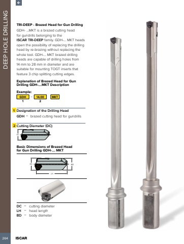 264 ISCAR DEEP HOLE DRILLINGTRI-DEEP - Brazed Head for Gun DrillingGDH- %u2026MKT is a brazed cutting headfor gundrills belonging to theISCAR TRI-DEEP family. GDH-%u2026 MKT heads open the possibility of replacing the drilling head by re-brazing without replacing the whole tool. GDH-%u2026 MKT brazed drilling heads are capable of drilling holes from 14 mm to 28 mm in diameter and are suitable for mounting TOGT inserts that feature 3 chip splitting cutting edges.Explanation of Brazed Head for Gun Drilling GDH-%u2026MKT DescriptionExample:GDH %u2013 14.00 MKT1 21 Designation of the Drilling HeadGDH %u2013 brazed cutting head for gundrills2 Cutting Diameter (DC)DCBasic Dimensions of Brazed Head for Gun Drilling GDH-%u2026 MKTDC BDDC %u2013 cutting diameterLH %u2013 head lengthBD %u2013 body diameter