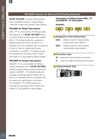 272 ISCAR DEEP HOLE DRILLINGTRI-DEEP Solution for BTA and DTS Drilling MethodsISCAR TRI-DEEP includes drilling heads with indexable inserts for deep drilling using the Single and Double Tube System.TRI-DEEP for Single Tube SystemDSD%u2026FT is a description of drilling heads belonging to the ISCAR TRI-DEEP family for deep drilling using single tube system. DSD%u2026 FT drilling heads are capable of drilling holes from 16 mm to 40 mm in diameter and are available with an external 4 start or internal single start thread connection. The DSD%u2026 FT drilling heads are suitable for mounting TOGT inserts that feature 3 chip splitting cutting edges.TRI-DEEP for Double Tube SystemDDD-EF%u2026FT is a description of drilling heads belonging to the ISCAR TRI-DEEPfamily for deep drilling using double tube system. DDD-EF%u2026 FT drilling heads are capable of drilling holes from18.4 mm to 28 mm in diameter and are available with an external 4 start thread connection. The DDD-EF%u2026 FT drilling heads are suitable for mounting TOGT inserts that feature 3 chip splitting cutting edges.Explanation of Drilling Heads DSD%u2026FT and DDD-EF%u2026FT DescriptionExample: DSD %u2013 EF %u2013 25.50 %u2013 FT1 2 31 Designation of the Drilling HeadDSD %u2013 drilling head for deep drilling using single tube systemDDD %u2013 drilling head for deep drilling using double tube system2 Connection TypeEF %u2013 external 4 start thread connectionIF %u2013 internal single start thread connection3 Cutting Diameter (DC)DCN