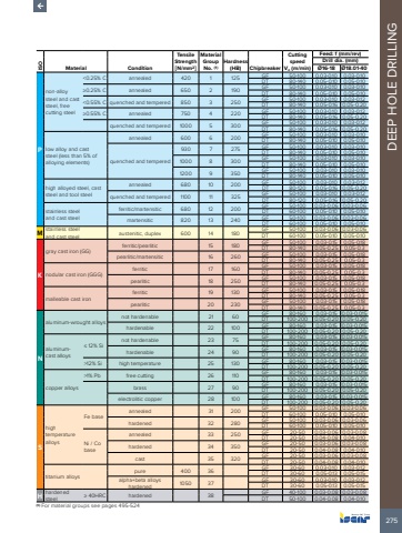 275DEEP HOLE DRILLING ISOMaterial ConditionTensile Strength [N/mm2]Material Group No. (1)Hardness (HB) ChipbreakerCutting speedVc (m/min)Feed: f (mm/rev)Drill dia. (mm)%u00d816-18 %u00d818.01-40Pnon-alloy steel and cast steel, free cutting steel<0.25% C annealed 420 1 125 GF 50-100 0.03-0.10 0.03-0.10DT 80-140 0.05-0.10 0.05-0.10%u22650.25% C annealed 650 2 190 GF 50-100 0.03-0.10 0.03-0.10DT 80-140 0.05-0.10 0.05-0.10<0.55% C quenched and tempered 850 3 250 GF 50-100 0.03-0.10 0.03-0.12DT 80-140 0.05-0.16 0.05-0.20%u22650.55% C annealed 750 4 220 GF 50-100 0.03-0.10 0.03-0.12DT 80-140 0.05-0.16 0.05-0.20quenched and tempered 1000 5 300 GF 50-100 0.03-0.10 0.03-0.12DT 80-140 0.05-0.16 0.05-0.20low alloy and cast steel (less than 5% of alloying elements)annealed 600 6 200 GF 50-100 0.03-0.10 0.03-0.10DT 80-140 0.05-0.10 0.05-0.10quenched and tempered930 7 275 GF 50-100 0.03-0.10 0.03-0.10DT 80-140 0.05-0.10 0.05-0.101000 8 300 GF 50-100 0.03-0.10 0.03-0.10DT 80-140 0.05-0.10 0.05-0.101200 9 350 GF 50-100 0.03-0.10 0.03-0.10DT 80-140 0.05-0.10 0.05-0.10high alloyed steel, cast steel and tool steelannealed 680 10 200 GF 50-100 0.03-0.10 0.03-0.12DT 80-120 0.05-0.16 0.05-0.20quenched and tempered 1100 11 325 GF 50-100 0.03-0.10 0.03-0.12DT 80-120 0.05-0.16 0.05-0.20stainless steel and cast steelferritic/martensitic 680 12 200 GF 50-100 0.03-0.06 0.03-0.06DT 60-100 0.05-0.10 0.05-0.10martensitic 820 13 240 GF 50-100 0.03-0.06 0.03-0.06DT 60-100 0.05-0.10 0.05-0.10M stainless steel and cast steel austenitic, duplex 600 14 180 GF 50-100 0.03-0.06 0.03-0.06DT 60-100 0.05-0.10 0.05-0.10Kgray cast iron (GG) ferritic/pearlitic 15 180 GF 50-100 0.03-0.15 0.05-0.18DT 80-140 0.05-0.25 0.05-0.3pearlitic/martensitic 16 260 GF 50-100 0.03-0.15 0.05-0.18DT 80-140 0.05-0.25 0.05-0.3nodular cast iron (GGG)ferritic 17 160 GF 50-100 0.03-0.15 0.05-0.18DT 80-140 0.05-0.25 0.05-0.3pearlitic 18 250 GF 50-100 0.03-0.15 0.05-0.18DT 80-140 0.05-0.25 0.05-0.3malleable cast ironferritic 19 130 GF 50-100 0.03-0.15 0.05-0.18DT 80-140 0.05-0.25 0.05-0.3pearlitic 20 230 GF 50-100 0.03-0.15 0.05-0.18DT 80-140 0.05-0.25 0.05-0.3Naluminum-wrought alloysnot hardenable 21 60 GF 80-160 0.03-0.15 0.03-0.015DT 100-200 0.05-0.20 0.05-0.20hardenable 22 100 GF 80-160 0.03-0.15 0.03-0.015DT 100-200 0.05-0.20 0.05-0.20aluminumcast alloys%u2264 12% Sinot hardenable 23 75 GF 80-160 0.03-0.15 0.03-0.015DT 100-200 0.05-0.20 0.05-0.20hardenable 24 90 GF 80-160 0.03-0.15 0.03-0.015DT 100-200 0.05-0.20 0.05-0.20>12% Si high temperature 25 130 GF 80-160 0.03-0.15 0.03-0.015DT 100-200 0.05-0.20 0.05-0.20copper alloys>1% Pb free cutting 26 110 GF 80-160 0.03-0.15 0.03-0.015DT 100-200 0.05-0.20 0.05-0.20brass 27 90 GF 80-160 0.03-0.15 0.03-0.015DT 100-200 0.05-0.20 0.05-0.20electrolitic copper 28 100 GF 80-160 0.03-0.15 0.03-0.015DT 100-200 0.05-0.20 0.05-0.20Shigh temperature alloysFe baseannealed 31 200 GF 50-100 0.03-0.06 0.03-0.06DT 60-100 0.05-0.10 0.05-0.10hardened 32 280 GF 50-100 0.03-0.06 0.03-0.06DT 60-100 0.05-0.10 0.05-0.10Ni / Co baseannealed 33 250 GF 20-50 0.03-0.06 0.03-0.08DT 20-50 0.04-0.08 0.04-0.10hardened 34 350 GF 20-50 0.03-0.06 0.03-0.08DT 20-50 0.04-0.08 0.04-0.10cast 35 320 GF 20-50 0.03-0.06 0.03-0.08DT 20-50 0.04-0.08 0.04-0.10titanium alloyspure 400 36 GF 30-60 0.03-0.10 0.03-0.12DT 30-60 0.05-0.13 0.05-0.15alpha+beta alloys hardened 1050 37 GF 30-60 0.03-0.10 0.03-0.12DT 30-60 0.05-0.13 0.05-0.15H hardened steel %u2265 40HRC hardened 38 GF 40-100 0.03-0.08 0.03-0.08DT 50-100 0.04-0.08 0.04-0.10 (1) For material groups see pages 495-524