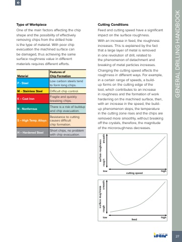 27GENERAL DRILLING HANDBOOKType of WorkpieceOne of the main factors affecting the chip shape and the possibility of effectively removing chips from the drilled hole is the type of material. With poor chip evacuation the machined surface can be damaged, thus achieving the same surface roughness value in different materials requires different efforts.MaterialFeatures of Chip FormationP - Steel Low carbon steels tend to form long chips.M %u2013 Stainless Steel Difficult chip control.K %u2013 Cast Iron Fragile and quickly breaking chips.N - Nonferrous There is a risk of buildup and chip evacuation.S %u2013 High Temp. AlloysResistance to cutting causes difficult chip formation.H %u2013 Hardened Steel Short chips, no problem with chip evacuation.Cutting ConditionsFeed and cutting speed have a significant impact on the surface roughness.With an increase in feed, the roughness increases. This is explained by the fact that a large layer of metal is removed in one revolution of drill, related to the phenomenon of detachment and breaking of metal particles increases.Changing the cutting speed affects the roughness in different ways. For example, in a certain range of speeds, a buildup forms on the cutting edge of the tool, which contributes to an increase in roughness and the formation of work hardening on the machined surface, then, with an increase in the speed, the buildup phenomenon stops, the temperature in the cutting zone rises and the chips are removed more smoothly, without breaking off the crystals, therefore, the magnitude of the microroughness decreases. surface roughness smooth roughlow high cutting speedsurface roughness smooth roughlow high feed