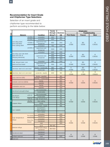 289DEEP HOLE DRILLINGRecommendation for Insert Grade and Chipformer Type SelectionsSelection of an insert grade and chipformer type recommended to perform according to the table belo ISOMaterial ConditionTensileStrength[N/mm2]HardnessHBChipbreakerTroubleshootingFirst Choice Fracure WearPnon-alloy steel and cast steel, free cutting steel<0.25% C annealed 420 125GIC908BGIC806BIC9025%u22650.25% C annealed 650 190<0.55% C quenched and tempered 850 250%u22650.55% Cannealed 750 220quenched and tempered 1000 300low alloy and cast steel (less than 5% of alloying elements)annealed 600 200GIC908BGIC806BIC9025 quenched and tempered930 2751000 3001200 350high alloyed steel, cast steel and tool steelannealed 680 200GIC908BGIC806BIC9025 quenched and tempered 1100 325stainless steel and cast steelferritic / martensitic 680 200 GIC908BGIC806Bmartensitic 820 240 IC9025M stainless steel and cast steel austenitic, duplex 600 180 GIC806BIC908BIC9025Kgray cast iron (GG) ferritic / pearlitic 180GIC908GIC806BIC9025pearlitic / martensitic 260nodular cast iron (GGG)ferritic 160pearlitic 250malleable cast ironferritic 130pearlitic 230Naluminum-wrought alloysnot hardenable 60GIC908GIC806BIC9025hardenable 100aluminumcast alloys%u226412% Sinot hardenable 75hardenable 90>12% Si high temperature 130copper alloys>1% Pb free cutting 110brass 90electrolytic copper 100non metallicduroplastics, fiber plasticshard rubberShigh temperature alloysFe basedannealed 200BIC806BIC908BIC9025hardened 280Ni or Co basedannealed 250hardened 350cast 320titanium alloyspure RM 400alpha+beta alloys, hardened RM 1050Hhardened steelhardenedBIC806BIC908BIC908hardenedchilled cast iron cast 400cast iron hardened