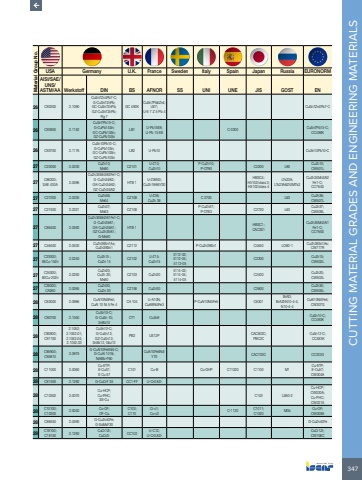 347CUTTING MATERIAL GRADES AND ENGINEERING MATERIALS Material Group No.USA Germany U.K. France Sweden Italy Spain Japan Russia EURONORMAISI/SAE/UNS/ASTM/AA Werkstoff DIN BS AFNOR SS UNI UNE JIS GOST EN26 C93200 2.1090CuSn7Zn4Pb7-C;G-CuSn7ZnPb;GC-CuSn7ZnPb;GZ-CuSn7ZnPb;Rg 7GC 493KCuSn7Pb6Zn4;UE7;U-E 7 Z 5 Pb 4CuSn7Zn4Pb7-C26 C93800 2.1182CuSn7Pb15-C;G-CuPb15Sn;GC-CuPb15Sn;GZ-CuPb15SnLB1 U-Pb15E8;U-Pb 15 E8 C-3300 CuSn7Pb15-C;CC496K26 C93700 2.1176CuSn10Pb10-C;G-CuPb10Sn;GC-CuPb10Sn;GZ-CuPb10SnLB2 U-Pb10 CuSn10Pb10-C27 C22000 2.0230 CuZn10;Ms90 CZ101 U-Z10;CuZn10P-CuZn10;P-OT90 C2200 L90 CuZn10;CW501L27 C86200;SAE 430A 2.0596CuZn34Mn3Al2Fe1-C;G-CuZn34Al2;GK-CuZn34Al2;GZ-CuZn34Al2HTB 1 U-Z36N3;CuZn19Al6Y20HBSC4;H5102/class 3;H5102/class 4LTs23A;LTs23A6Zh3MTs2CuZn34Mn3Al2 Fe1-C;CC764S27 C27200 2.0335 CuZn36;Ms64 CZ108 U-Z36;CuZn 36 C 2700 L63 CuZn36;CW507L27 C27400 2.0321 CuZn37;Ms63 CZ108 P-CuZn37;P-OT63 C2720 L63 CuZn37;CW508L27 C86400 2.0592CuZn35Mn2Al1Fe1-C;G-CuZn35Al1;GK-CuZn35Al1;GZ-CuZn35Al1;G-Ms60HTB 1 HBSC1;CAC301CuZn35Mn2Al1 Fe1-C;CC765S27 C46400 2.0530 CuZn38Sn1As;CuZn38Sn1 CZ112 P-CuZn39Sn1 C4640 LO60-1 CuZn38Sn1As;CW717R27 C23000;85Cu-15Zn 2.0240 CuZn15 ;CuZn 15 CZ102 U-Z15;CuZn155112-02;5112-04;5112-05C2300 CuZn15;CW502L27 C24000;80Cu-20Zn 2.0250CuZn20;CuZn 20;Ms80CZ103 CuZn205114-02;5114-04;5114-05C2400 CuZn20;CW503L27 C26000;CA260 2.0265 CuZn30;CuZn 30 CZ106 CuZn30 C2600 CuZn30;CW505L28 C63000 2.0966 CuAl10Ni5Fe4;CuAI 10 Ni 5 Fe 4 CA 104 U-A10N;CuAl9Ni5Fe3 P-CuAl10Ni5Fe5 C6301BrAD;BrAZhN10-4-4;N10-4-4CuAl10Ni5Fe4;CW307G28 C90700 2.1050CuSn10-C;G-CuSn 10;SnBz10CT1 CuSn8 CuSn10-C;CC480K28 C90800;C917002.1052;2.1052.01;2.1052.04;2.1052.03CuSn12-C;G-CuSn12;GZ-CuSn12;SnBz12, Gbz12PB2 UE12P CAC502C;PBC2CCuSn12-C; CC483K28 C95800;C95810 2.0975G-CuAl10Fe5Ni5-C;G-CuAI 10 Ni;NiAlBz-F60CuAl10Fe5Ni5 Y70 CAC703C CC333G28 C11000 2.0060Cu-ETP;E-Cu57;E Cu 57C101 Cu-B Cu-DHP C11020 C1100 M1Cu-ETP;E-Cu57;CW004A28 C81500 2.1292 G-CuCrF 35 CC1-FF U-Cr0.8Zr28 C10300 2.0070Cu-HCP;Cu-PHC;SE-CuC103 LS60-2Cu-HCP;CW020A;Cu-PHC;CW021A28 C10100;C10200 2.0040 Cu-OF;OF-CuC103;C110Ci-c1;Cu-c2 C-1120 C1011;C1020 M0b Cu-OF;CW008A28 C86550 2.0590 G-CuZn40Fe;G-SoMsF30 G-CuZn40Fe28 C18100;C18150 2.1293 CuCr1Zr;CuCrZr CC102 U-C1Z;U-Cr0.8ZrCuCr1Zr;CW106C