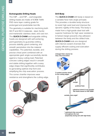52 ISCAR GENERAL PURPOSE DRILLINGExchangeable Drilling HeadsThe H3P %u2026 and F3P %u2026 exchangeable drilling heads are made of IC908 TiAlN PVD nano layer coating grade for prolonged and predictable tool life. The geometry is suitable for machining both ISO P and ISO K materials - steel, ferritic and martensitic stainless steel, and cast iron. The QUICK-3-CHAM exchangeable drilling heads are designed with self-centering point geometry to guarantee drilling process stability, good centering, and smooth penetration into the material capabilities. The patented, durable, and precise chisel point combined with an appropriate gash angle successfully stands against a heavy cutting load. Patented concave cutting edges result in smooth and stable drilling together with a wavy edge shape that significantly contributes to generating optimal chip form and simplifying the chip evacuation process. The corner chamfer improves wear resistance and strengthens the cutting edge. Drill BodyThe QUICK-3-CHAM drill body is based on a variable flute helix angle principle. This provides a durable body structure to resist high axial load and improve the dynamic rigidity of the body. The body is made from a high-grade steel tool with superior hardness for high wear resistance. A helical margin prevents chip adhesion between the body and the drilled hole. QUICK-3-CHAM tools are designed with internal coolant channels that supply efficient cooling and lubrication during the drilling process.variable flute angle** optimized chip evacuation* strengthens the tool (especially during exit with high feed)enlarged flute volume for easy chip evacuation3 coolant nozzles aimed to the cutting edgesmarginpolished flutecylindrical shank & one parallel flat shank based on ISO 9266