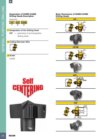 64 ISCAR GENERAL PURPOSE DRILLINGExplanation of SUMO-CHAM Drilling Heads Description Example:ICP 225 IC9081 2 31 Designation of the Drilling HeadICP %u2014 geometry of exchangeable drilling head2 Cutting Diameter (DC) DC3 GradeIC908Basic Dimensions of SUMO-CHAM Drilling HeadsICP %u2026PL LFDC SIGICP-2MLF PLDC SIGHCP %u2026DCLFKCHCHWPLFCPDCKCH CHWSIG PDDLF PL