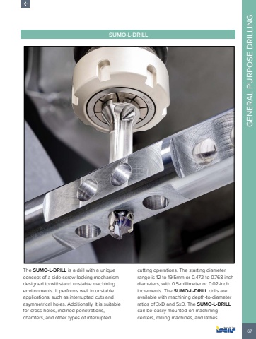 67GENERAL PURPOSE DRILLINGSUMO-L-DRILLThe SUMO-L-DRILL is a drill with a unique concept of a side screw locking mechanism designed to withstand unstable machining environments. It performs well in unstable applications, such as interrupted cuts and asymmetrical holes. Additionally, it is suitable for cross-holes, inclined penetrations, chamfers, and other types of interrupted cutting operations. The starting diameter range is 12 to 19.5mm or 0.472 to 0.768-inch diameters, with 0.5-millimeter or 0.02-inch increments. The SUMO-L-DRILL drills are available with machining depth-to-diameter ratios of 3xD and 5xD. The SUMO-L-DRILLcan be easily mounted on machining centers, milling machines, and lathes.