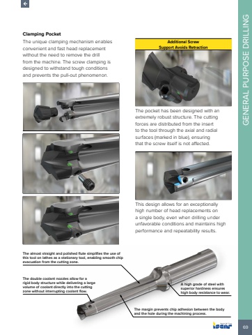 69GENERAL PURPOSE DRILLINGClamping PocketThe unique clamping mechanism enables convenient and fast head replacement without the need to remove the drill from the machine. The screw clamping is designed to withstand tough conditions and prevents the pull-out phenomenon.Additional Screw Support Avoids RetractionThe pocket has been designed with an extremely robust structure. The cutting forces are distributed from the insert to the tool through the axial and radial surfaces (marked in blue), ensuring that the screw itself is not affected.This design allows for an exceptionally high number of head replacements on a single body, even when drilling under unfavorable conditions and maintains high performance and repeatability results.The almost straight and polished flute simplifies the use of this tool on lathes as a stationary tool, enabling smooth chip evacuation from the cutting zone.A high grade of steel with superior hardness ensures high body resistance to wear.The margin prevents chip adhesion between the body and the hole during the machining process. The double coolant nozzles allow for a rigid body structure while delivering a large volume of coolant directly into the cutting zone without interrupting coolant flow.