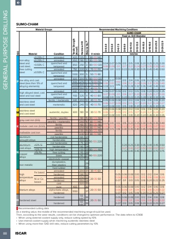 88 ISCAR GENERAL PURPOSE DRILLINGSUMO-CHAMMaterial Groups Recommended Machining ConditionsISOMaterial Condition Tensile Strength [N/mm2] Hardness HB Material No.(1)V m/minSUMO-CHAMFeed vs. Drill DiameterD=4-4.9 D=5-5.9 D=6-7.9 D=8-9.9 D=10-11.9 D=12-13.9 D=14-15.9 D=16-19.9 D=20-25.9 D=26-32.9mm/revPnon-alloy steel and cast steel, free cutting steel<0.25% C annealed 420 125 1 80-110-1400.040.060.080.070.090.110.090.110.130.120.170.220.150.210.280.180.240.300.200.270.350.250.350.450.250.350.450.300.400.50%u22650.25% C annealed 650 190 2 80-105-130<0.55% C quenched and tempered 850 250 3 80-100-120%u22650.55% Cannealed 750 220 4 70-90-110quenched and tempered 1000 300 5 50-70-90low alloy and cast steel (less than 5% of alloying elements)annealed 600 200 6 80-100-120 0.040.060.080.070.100.130.090.120.150.120.180.250.140.210.280.160.240.320.180.260.350.230.310.400.250.350.450.300.400.50quenched and tempered930 275 7 70-90-1101000 300 8 50-70-901200 350 9 40-55-70high alloyed steel, cast steel and tool steelannealed 680 200 10 50-70-90 0.060.070.080.070.090.100.090.110.120.120.160.200.120.170.220.150.200.250.180.230.280.200.250.300.220.270.330.250.300.35quenched and tempered 1100 325 11 40-60-80stainless steel and cast steelferritic / martensitic 680 200 12 40-55-70 0.050.060.070.060.070.080.080.090.100.100.120.150.120.150.180.140.170.200.160.200.240.160.210.260.180.240.300.200.270.35 martensitic 820 240 13 40-55-70M stainless steel and cast steel austenitic, duplex 600 180 14 30-50-700.050.060.070.060.070.080.080.090.100.100.120.150.120.150.180.140.170.200.160.200.240.160.210.260.180.240.300.200.270.35Kgray cast iron (GG) ferritic / pearlitic 180 15 90-125-1600.040.060.080.100.130.150.120.150.180.150.220.300.200.270.350.250.320.400.300.370.450.350.450.550.350.470.600.400.500.60pearlitic / martensitic 260 16 80-110-140nodular cast iron (GGG) ferritic 160 17 90-135-180pearlitic 250 18 80-110-140malleable cast iron ferritic 130 19 90-125-160pearlitic 230 20 80-110-140Naluminumwrought alloysnot hardenable 60 2190-155-2200.200.270.350.250.320.400.300.370.450.350.420.500.400.500.600.450.570.700.500.670.75hardenable 100 22aluminumcast alloys%u226412% Si not hardenable 75 23hardenable 90 24>12% Si high temperature 130 25 80-120-160copper alloys>1% Pb free cutting 110 26brass 90 27 90-155-220electrolytic copper 100 28non metallicduroplastics, fiber plastics 29hard rubber 30Shigh temperature alloysFe based annealed 200 31 30-45-600.050.060.070.060.080.110.080.100.130.100.120.150.120.150.180.120.160.200.140.180.220.160.200.25hardened 280 32Ni or Co 20-35-50 basedannealed 250 33hardened 350 34cast 320 35titanium alloyspure 400 3620-35-500.050.060.070.060.090.120.080.110.150.100.140.180.120.160.200.140.180.220.160.200.250.180.220.27alpha+beta alloys, hardened 1050 37H hardened steelhardened 55 HRC 3820-35-500.050.060.070.060.090.120.080.110.150.100.140.180.120.160.200.140.180.220.160.200.250.180.22hardened 0.27 60 HRC 39 Recommended cutting dataAs a starting value, the middle of the recommended machining range should be used.Then, according to the wear results, conditions can be changed to optimize performance. The data refers to IC908%u2022 When using external coolant supply only, reduce cutting speed by 10%%u2022 Use internal coolant supply when machining austenitic stainless steel%u2022 When using more than 5XD drill ratio, reduce cutting parameters by 10%