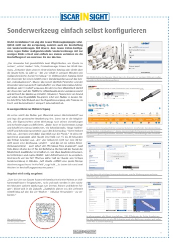 Sonderwerkzeug einfach selbst konfigurierenISCAR revolutioniert im Zug der neuen Werkzeugkampagne LOGIQUICK nicht nur die Zerspanung, sondern auch die Beschaffung von Sonderwerkzeugen. Mit iQuote, dem neuen Online-Konfigurator, legen Nutzer ma%u00dfgeschneiderte Sonderwerkzeuge mit nur wenigen Klicks schnell und einfach aus. Zudem verk%u00fcrzen sie die Beschaffungszeit um rund zwei bis drei Wochen. %u201eDer Anwender hat grunds%u00e4tzlich zwei M%u00f6glichkeiten, um iQuote zu nutzen%u201c, erkl%u00e4rt Herbert Volk, Produktmanager Fr%u00e4sen bei ISCAR Germany. %u201eEntweder %u00fcber unseren elektronischen Katalog oder direkt %u00fcber die iQuote-Seite. So oder so %u2013 der User erh%u00e4lt in wenigen Minuten sein ma%u00dfgeschneidertes Sonderwerkzeug.%u201c Im elektronischen Katalog klickt der Anwender bei einem bestehenden Standardwerkzeug auf das Symbol %u201eIndividualisieren%u201c. iQuote %u00fcbernimmt s%u00e4mtlich Parameter und der Anwender kann nun gezielt Eigenschaften wie etwa Eckenradius, Schneidenl%u00e4nge oder Freischliff anpassen. Bei der zweiten M%u00f6glichkeit startet der Anwender auf der Plattform (https://iquote.ssl.imc-companies.com/) und definiert das Werkzeug mit allen relevanten Parametern von Grund auf selbst. Das KI-gest%u00fctzte Programm leitet den Nutzer in beiden F%u00e4llen Schritt f%u00fcr Schritt durch den Konfigurationsvorgang, alle Prozesse im Front- und Backend laufen komplett automatisiert ab.In wenigen Klicks zur Ma%u00dfanfertigungAls erstes w%u00e4hlt der Nutzer per Mausklick seinen Werkst%u00fcckstoff aus und legt die gew%u00fcnschte Bearbeitung fest. Dann hat er die M%u00f6glichkeit, alle Eigenschaften seines Werkzeugs nach seinen Vorstellungen und Anforderungen zu definieren. %u201eDabei kann er Durchmesser, L%u00e4nge und Schaftform ebenso bestimmen, wie Schneidenzahl, -l%u00e4nge Halsfreischliff und Schneidengeometrie sowie den Eckenradius,%u201c f%u00fchrt Herbert Volk aus. %u201eGrenzen setzt dabei eigentlich nur die Physik.%u201c Ist alles entsprechend angepasst, gibt iQuote innerhalb von 15 bis 20 Sekunden das fertige Angebot aus. %u201eDer User bekommt nicht nur eine 3D-Ansicht sowie eine Zeichnung, sondern %u2013 und das ist ein echtes Alleinstellungsmerkmal %u2013 auch sofort den Werkzeug-Preis angezeigt%u201c, sagt Volk. Dann ist alles bereit f%u00fcr die Bestellung. Hierbei hat der Kunde die M%u00f6glichkeit, zus%u00e4tzliche Informationen, wie etwa Bauteilzeichnungen, zu hinterlegen und eigene Bestell- oder Artikelnummern zu vergeben.Und bereits vier bis f%u00fcnf Wochen sp%u00e4ter hat der Kunde sein fertiges Sonderwerkzeug in H%u00e4nden. %u201eMit iQuote entf%u00e4llt eine ganze Menge Abstimmungsaufwand im Vorfeld%u201c, sagt Volk. %u201eSo lassen sich rund zwei Wochen im Beschaffungsprozess einsparen.%u201cAngebot wird stetig ausgebaut %u201eZum Go-Live von iQuote haben wir bereits eine breite Palette an Vollhartmetallfr%u00e4sern freigeschaltet, nach und nach werden in den n%u00e4chsten Monaten weitere Werkzeuge zum Drehen, Fr%u00e4sen und Bohren folgen%u201c, blickt Volk in die Zukunft. %u201eZus%u00e4tzlich planen wir, die Lieferzeit mittelfristig auf drei bis vier Wochen %u2013 inklusive Versandzeit %u2013 zu verk%u00fcrzen.%u201cIm elektronischen Katalog klickt der Anwender bei einem bestehenden Standardwerkzeugauf das Symbol %u201eIndividualisieren%u201c. iQuote %u00fcbernimmt s%u00e4mtlich Parameter und der Anwender kann nun gezielt Eigenschaften wie etwa Eckenradius, Schneidenl%u00e4nge oder Freischliffanpassen.Ist alles angepasst, gibt iQuote innerhalb von 15 bis 20 Sekunden das fertige Angebot aus. Der User bekommt nicht nur eine 3D-Animation sowie eine Zeichnung, sondern auch sofort einen Preis zu seinem Werkzeug.Mit ISCARs Online-Konfigurator iQuote kann der Anwender mit wenigen Klicks sein ma%u00dfgeschneidertes Sonderwerkzeug auslegen.Der User kann alle wichtigen Parameter bestimmen und das Werkzeug genau auf seine Anforderungen abstimmen.Hier geht%u2019s direkt auf die iQuote-Seite.11