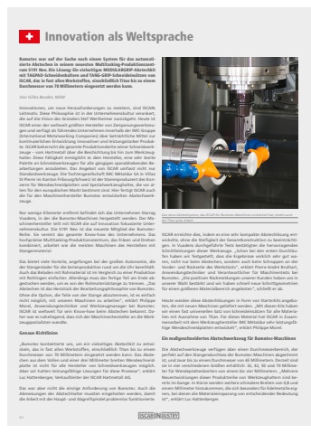 Innovation als WeltspracheBumotec war auf der Suche nach einem System f%u00fcr das automatisierte Abstechen in seinem neuesten Multitasking-Produktionszentrum S191 Neo. Die L%u00f6sung: Ein vielseitiges MODULARGRIP-Abstechkit mit TAGPAD-Schneidenhaltern und TANG-GRIP-Schneideins%u00e4tzen von ISCAR, das in fast allen Werkstoffen, einschlie%u00dflich Titan bis zu einem Durchmesser von 70 Millimetern eingesetzt werden kann.Von Gilles Bordet, MSMInnovationen, um neue Herausforderungen zu meistern, sind ISCARs Leitmotiv. Diese Philosophie ist in der Unternehmenskultur verankert, die auf die Vision des Gr%u00fcnders Stef Wertheimer zur%u00fcckgeht. Heute ist ISCAR einer der weltweit gr%u00f6%u00dften Hersteller von Zerspanungswerkzeugen und verf%u00fcgt als f%u00fchrendes Unternehmen innerhalb der IMC-Gruppe (International Metalworking Companies) %u00fcber betr%u00e4chtliche Mittel zur kontinuierlichen Entwicklung innovativer und leistungsstarker Produkte. ISCAR beherrscht die gesamte Produktionskette seiner Schneidwerkzeuge %u2013 vom Hartmetall %u00fcber die Beschichtung bis hin zum Werkzeughalter. Diese F%u00e4higkeit erm%u00f6glicht es dem Hersteller, eine sehr breite Palette an Schneidwerkzeugen f%u00fcr alle g%u00e4ngigen spanabhebenden Bearbeitungen anzubieten. Das Angebot von ISCAR umfasst nicht nur Standardwerkzeuge. Die Tochtergesellschaft IMC M%u00e9taldur SA in Villaz St-Pierre im Kanton Fribourg/Schweiz ist der Stammproduzent des Konzerns f%u00fcr Wendeschneidplatten und Spezialwerkzeughalter, die vor allem f%u00fcr den europ%u00e4ischen Markt bestimmt sind. Hier fertigt ISCAR auch die f%u00fcr den Maschinenhersteller Bumotec entwickelten Abstechwerkzeuge.Nur wenige Kilometer entfernt befindet sich das Unternehmen StarragVuadens, in der die Bumotec-Maschinen hergestellt werden. Der Maschinenhersteller teilt mit ISCAR die auf Innovation fokussierte Unternehmenskultur. Die S191 Neo ist das neueste Mitglied der BumotecReihe. Sie vereint das gesamte Know-how des Unternehmens. Das hochpr%u00e4zise Multitasking-Produktionszentrum, das Fr%u00e4sen und Drehen kombiniert, arbeitet wie die meisten Maschinen des Herstellers mit Stangenmaterial.Das bietet viele Vorteile, angefangen bei der gro%u00dfen Autonomie, die der Stangenlader f%u00fcr die Serienproduktion rund um die Uhr bereith%u00e4lt.Auch das Beladen mit Rohmaterial ist im Vergleich zu einer Produktion mit Rohlingen einfacher. Allerdings muss das fertige Teil am Ende abgestochen werden, um es von der Rohmaterialstange zu trennen. %u201eDas Abstechen ist das Herzst%u00fcck der Bearbeitungsphilosophie von Bumotec.Ohne die Option, die Teile von der Stange abzutrennen, ist es einfach nicht m%u00f6glich, mit unseren Maschinen zu arbeiten%u201c, erkl%u00e4rt Philippe Morel, Anwendungstechniker und Werkzeugmanager bei Bumotec.ISCAR ist weltweit f%u00fcr sein Know-how beim Abstechen bekannt. Daher war es naheliegend, dass sich der Maschinenhersteller an die Werkzeugspezialisten wandte.Genaue Richtlinien%u201eBumotec kontaktierte uns, um ein vielseitiges Abstechkit zu entwickeln, das in fast allen Werkstoffen, einschlie%u00dflich Titan bis zu einem Durchmesser von 70 Millimetern eingesetzt werden kann. Das Abstechen aus dem Vollen und einer drei Millimeter breiten Wendeschneidplatte ist nicht f%u00fcr alle Hersteller von Schneidwerkzeugen m%u00f6glich.Aber wir hatten leistungsf%u00e4hige L%u00f6sungen f%u00fcr diese Prozesse%u201c, erkl%u00e4rt Luc Hattenberger, Verkaufsleiter der ISCAR Hartmetall AG.Das war aber nicht die einzige Anforderung von Bumotec. Auch die Abmessungen der Abstechhalter mussten eingehalten werden, damit die Arbeit mit der Haupt- und Abgreifspindel problemlos funktionierte.ISCAR erreichte dies, indem es eine sehr kompakte Abstechl%u00f6sung entwickelte, ohne die Steifigkeit der Gesamtkonstruktion zu beeintr%u00e4chtigen. In Vuadens durchgef%u00fchrte Tests best%u00e4tigten die hervorragenden Schnittleistungen dieser Werkzeuge. %u201eSchon bei den ersten Durchl%u00e4ufen haben wir festgestellt, dass die Ergebnisse wirklich sehr gut waren, nicht nur beim Abstechen, sondern auch beim Schruppen an der Vorder- und R%u00fcckseite des Werkst%u00fccks%u201c, erkl%u00e4rt Pierre-Andr%u00e9 Brulhart, Anwendungstechniker und Verantwortlicher f%u00fcr Maschinentests bei Bumotec. %u201eDie positiven R%u00fcckmeldungen unserer Kunden haben uns in unserer Wahl best%u00e4rkt und wir haben schnell neue Schnittgeometrien f%u00fcr einen gr%u00f6%u00dferen Materialbereich angeboten%u201c, schlie%u00dft er ab.Heute werden diese Abstechl%u00f6sungen in Form von Starterkits angeboten, die mit neuen Maschinen geliefert werden. %u201eMit diesen Kits haben wir einen fast universellen Satz von Schneideins%u00e4tzen f%u00fcr alle Materialien mit Ausnahme von Titan. F%u00fcr dieses Material hat ISCAR in Zusammenarbeit mit dem Werkzeughersteller IMC M%u00e9taldur sehr leistungsf%u00e4hige Wendeschneidplatten entwickelt%u201c, erkl%u00e4rt Philippe Morel.Ein ma%u00dfgeschneidertes Abstechwerkzeug f%u00fcr Bumotec-MaschinenDie Abstechwerkzeuge verf%u00fcgen %u00fcber einen Durchmesserbereich, der perfekt auf den Stangendurchlass der Bumotec-Maschinen abgestimmt ist, und zwar bis zu einem Durchmesser von 65 Millimetern. Derzeit sind sie in vier verschiedenen Gr%u00f6%u00dfen erh%u00e4ltlich: 32, 42, 50 und 70 Millimeter f%u00fcr Wendeplattenbreiten von einem bis vier Millimetern. %u201eMehrere Neuentwicklungen dieser Produktreihe von Werkzeughaltern sind bereits im Gange. In K%u00fcrze werden weitere schmalere Breiten von 0,8 und einem Millimeter hinzukommen, die sich besonders f%u00fcr Edelmetalle eignen, bei denen die Materialeinsparung von entscheidender Bedeutung ist%u201c, erkl%u00e4rt Luc Hattenberger.Das neue Abstechsystem, das ISCAR f%u00fcr Bumotec-Maschinen entwickelt hat, leistet auch bei Titan gute Arbeit.62