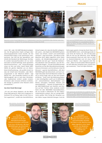 PRAXISFR%u00c4SEN BOHREN DREHEN STECHEN INDUSTRIENsowie ISO- oder DO-GRIP-Wendeschneidplatten. Die 3D-gedruckten K%u00f6pfe verf%u00fcgen %u00fcber str%u00f6mungsoptimierte innere Kan%u00e4le, die das Schmiermittel direkt in die Schnittzone transportieren. Das hilft bei der Spanabfuhr und erh%u00f6ht die Standzeit der Werkzeuge. Die K%u00f6pfe werden benutzerfreundlich mit nur einer Schraube im Schaft befestigt. Dank speziellem Klemmmechanismus und Vierpunktanlage sitzen sie fest und sicher. Damit bietet NEOSWISS die gleiche Stabilit%u00e4t wie ein Monoblock-Schaftwerkzeug. %u201eDer gr%u00f6%u00dfte Vorteil ist, dass der Schaft beim Schneiden- oder Werkzeugwechsel in der Maschine bleibt%u201c, sagt Michel Trill. %u201eDer Anwender entfernt nur den Werkzeugkopf, den er nach dem Schneidenoder Kopfwechsel einfach wieder einsetzt.Einmessen oder erneutes Anfahren entfallen, die Anlage ist praktisch ohne R%u00fcstzeit sofort einsatzbereit.%u201cAus dem Stand %u00fcberzeugt%u201eIch war erst etwas skeptisch, ob das Werkzeug stabil genug ist. Aber da es insgesamt interessant f%u00fcr uns klang, habe ich den Tests sofort zugestimmt%u201c, erz%u00e4hlt der Gesch%u00e4ftsf%u00fchrer.Schnell zeigte sich, dass die Zweifel unbegr%u00fcndet waren. %u201eDie K%u00f6pfe des NEOSWISS-Systems lassen sich einfach, schnell und komfortabel wechseln%u201c, sagt Jonas Ecker. %u201eDer Mann an der Maschine kann dabei eigentlich nichts falsch machen, die Wiederholgenauigkeit und die Stabilit%u00e4t sind sehr gut.%u201c Dank der Bedienerfreundlichkeit sinkt die R%u00fcstzeit, was die Produktivit%u00e4t steigert. %u201eF%u00fcr den Schneidenwechsel brauchten wir bei den Monoblockwerkzeugen inklusive Einmessen und Korrekturen etwa 20 Minuten%u201c, sagt der Gesch%u00e4ftsf%u00fchrer. %u201eMit dem NEOSWISS geht das blitzschnell, und nach wenigen Sekunden l%u00e4uft die Maschine wieder. Da war es keine Frage, dass wir das neue System einf%u00fchren.%u201c Stork nutzt das Werkzeug-System in den Schaftgr%u00f6%u00dfen zw%u00f6lf und 16 Millimeter mit unterschiedlichen Wechselk%u00f6pfen zum Planen, Schruppen, Schlichten, Stechen und Gewindedrehen %u2013 neueste Errungenschaft ist der NEOYSWISS-Kopf zum Stechen und Drehen auf der Y-Achse. Unter anderem erstellt Stork mit dem NEOSWISS Gewindebuchsen, die ein Kunde in Maschinen f%u00fcr die Lebensmittelindustrie verbaut. Die nur wenige Millimeter gro%u00dfen Teile fertigt der Zerspaner aus drei Meter langen Edelstahl-Stangen. Sind die Besprechen weitere Einsatzm%u00f6glichkeiten (v.l.): Produktionsleiter Jonas Ecker, Gesch%u00e4ftsf%u00fchrer Bj%u00f6rn Birkholz, beide Stork Automatendreherei, und Michel Trill, technische Beratung und Verkauf bei ISCAR.Bohrungen gesetzt, bringt das Stork-Team mit dem NEOSWISS Innen- und Au%u00dfengewinde ein und sticht die Buchse ab. Alle 30 Sekunden f%u00e4llt ein Teil aus der Maschine, etwa 100.000 St%u00fcck produziert Stork pro Jahr. Das Los l%u00e4uft im Zweischichtbetrieb und mit etwa 10.000 Teilen pro Woche %u2013 also insgesamt zehn Wochen. %u201eWenn ich da bei jedem Werkzeugwechsel zehn Minuten einsparen kann, kommt einiges zusammen,%u201c freut sich Bj%u00f6rn Birkholz.F%u00fcr den Schneidenwechsel brauchten wir bei den Monoblockwerkzeugen inklusive Einmessen und Korrekturen etwa 20 Minuten. Mit dem NEOSWISS geht das blitzschnell, und nach zehn Minuten l%u00e4uft die Maschine wieder.Bj%u00f6rn Birkholz, Gesch%u00e4ftsf%u00fchrer der Stork AutomatendrehereiJonas Ecker, Produktionsleiter der Stork AutomatendrehereiStork nutzt das NEOSWISS-System in den Schaftgr%u00f6%u00dfen zw%u00f6lf und 16 Millimeter mit unterschiedlichen Wechselk%u00f6pfen zum Planen, Schruppen, Schlichten, Stechen und Gewindestechen.Haben gemeinsam die R%u00fcstzeiten der Langdreher bei Storkreduziert (v.l.): Bj%u00f6rn Birkholz, Gesch%u00e4ftsf%u00fchrer der Stork Automatendreherei, Michel Trill, technische Beratung und Verkauf bei ISCAR, und Stork-Produktionsleiter Jonas Ecker.Die K%u00f6pfe des NEOSWISS-Systems lassen sich einfach, schnell und komfortabel wechseln. Der Mann an der Maschine kann dabei eigentlich nichts falsch machen, die Wiederholgenauigkeit und die Stabilit%u00e4t sind sehr gut.39