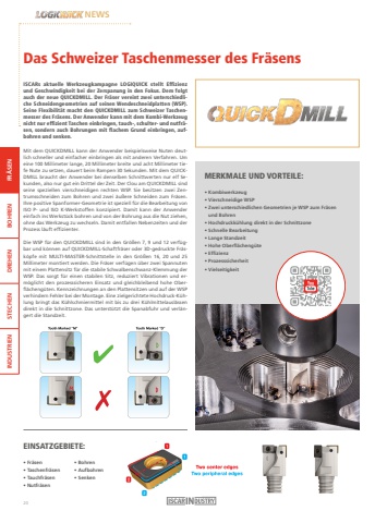 FR%u00c4SEN BOHREN DREHEN STECHEN INDUSTRIENNEWSDas Schweizer Taschenmesser des Fr%u00e4sensISCARs aktuelle Werkzeugkampagne LOGIQUICK stellt Effizienz und Geschwindigkeit bei der Zerspanung in den Fokus. Dem folgt auch der neue QUICKDMILL. Der Fr%u00e4ser vereint zwei unterschiedliche Schneidengeometrien auf seinen Wendeschneidplatten (WSP). Seine Flexibilit%u00e4t macht den QUICKDMILL zum Schweizer Taschenmesser des Fr%u00e4sens. Der Anwender kann mit dem Kombi-Werkzeug nicht nur effizient Taschen einbringen, tauch-, schulter- und nutfr%u00e4sen, sondern auch Bohrungen mit flachem Grund einbringen, aufbohren und senken.Mit dem QUICKDMILL kann der Anwender beispielsweise Nuten deutlich schneller und einfacher einbringen als mit anderen Verfahren. Um eine 100 Millimeter lange, 20 Millimeter breite und acht Millimeter tiefe Nute zu setzen, dauert beim Rampen 30 Sekunden. Mit dem QUICKDMILL braucht der Anwender bei denselben Schnittwerten nur elf Sekunden, also nur gut ein Drittel der Zeit. Der Clou am QUICKDMILL sind seine speziellen vierschneidigen rechten WSP. Sie besitzen zwei Zentrumsschneiden zum Bohren und zwei %u00e4u%u00dfere Schneiden zum Fr%u00e4sen.Ihre positive Spanformer-Geometrie ist speziell f%u00fcr die Bearbeitung von ISO P- und ISO K-Werkstoffen konzipiert. Damit kann der Anwender einfach ins Werkst%u00fcck bohren und von der Bohrung aus die Nut ziehen, ohne das Werkzeug zu wechseln. Damit entfallen Nebenzeiten und der Prozess l%u00e4uft effizienter.Die WSP f%u00fcr den QUICKDMILL sind in den Gr%u00f6%u00dfen 7, 9 und 12 verf%u00fcgbar und k%u00f6nnen auf QUICKDMILL-Schaftfr%u00e4ser oder 3D-gedruckte Fr%u00e4sk%u00f6pfe mit MULTI-MASTER-Schnittstelle in den Gr%u00f6%u00dfen 16, 20 und 25 Millimeter montiert werden. Die Fr%u00e4ser verf%u00fcgen %u00fcber zwei Spannuten mit einem Plattensitz f%u00fcr die stabile Schwalbenschwanz-Klemmung der WSP. Das sorgt f%u00fcr einen stabilen Sitz, reduziert Vibrationen und erm%u00f6glicht den prozesssicheren Einsatz und gleichbleibend hohe Oberfl%u00e4cheng%u00fcten. Kennzeichnungen an den Plattensitzen und auf der WSP verhindern Fehler bei der Montage. Eine zielgerichtete Hochdruck-K%u00fchlung bringt das K%u00fchlschmiermittel mit bis zu drei K%u00fchlmittelausl%u00e4ssen direkt in die Schnittzone. Das unterst%u00fctzt die Spanabfuhr und verl%u00e4ngert die Standzeit.EINSATZGEBIETE:%u2022 Fr%u00e4sen%u2022 Taschenfr%u00e4sen%u2022 Tauchfr%u00e4sen%u2022 Nutfr%u00e4sen%u2022 Bohren%u2022 Aufbohren%u2022 Senken MERKMALE UND VORTEILE:%u2022 Kombiwerkzeug%u2022 Vierschneidige WSP %u2022 Zwei unterschiedlichen Geometrien je WSP zum Fr%u00e4sen und Bohren%u2022 Hochdruckk%u00fchlung direkt in der Schnittzone%u2022 Schnelle Bearbeitung%u2022 Lange Standzeit%u2022 Hohe Oberfl%u00e4cheng%u00fcte%u2022 Effizienz%u2022 Prozesssicherheit%u2022 Vielseitigkeit20