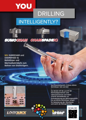 www.isca r.comYOUDRILLINGSCAN MEDie NEUEN IHP-BD und IFP-BDBohrkopfgeometrien sindselbstzentrierend und habenscharfe Schneidecken zurGratreduzierung am Bohrungsaustritt.Die verst%u00e4rkte Bohrk%u00f6rper sorgenf%u00fcr Reduzierung der Vibrationenund somit der Bohrger%u00e4usche.Durchmesserbereich: 13.5mm-40mmBohrk%u00f6rper: 5xD und 8xDNEU SUMOCHAM undCHAMSPADE-IQBohrk%u00f6rper undWechselbohrk%u00f6pfe zumBohren von Stahltr%u00e4gern.INTELLIGENTLY?
